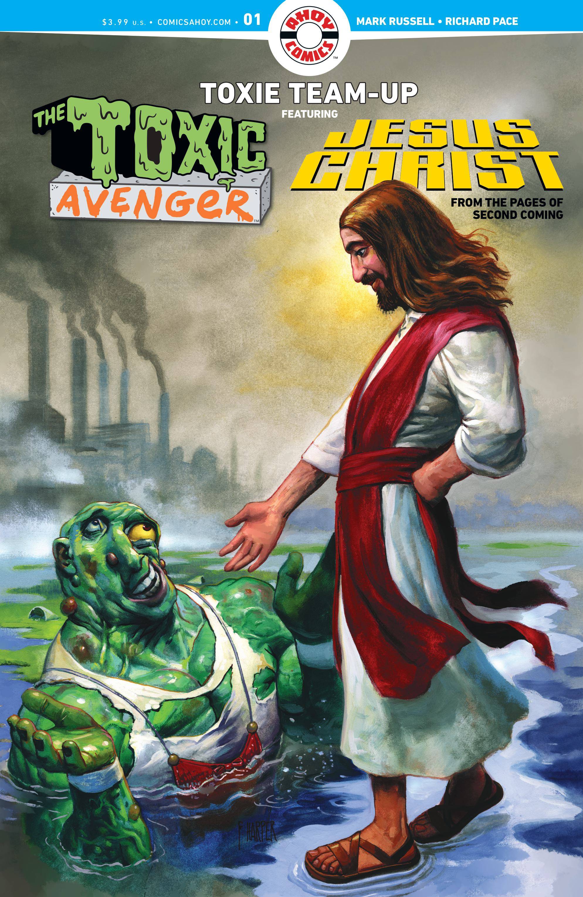 Toxie Team-Up #1 is written and illustrated by Mark Russell and Richard Pace, the creative team behind Second Coming. Russell commented in AHOY's press release, stating the collaboration is a long-awaited pairing, highlighting Christ's approach to conflict resolution and the relatable aspects of Tromaville for someone familiar with bullying.